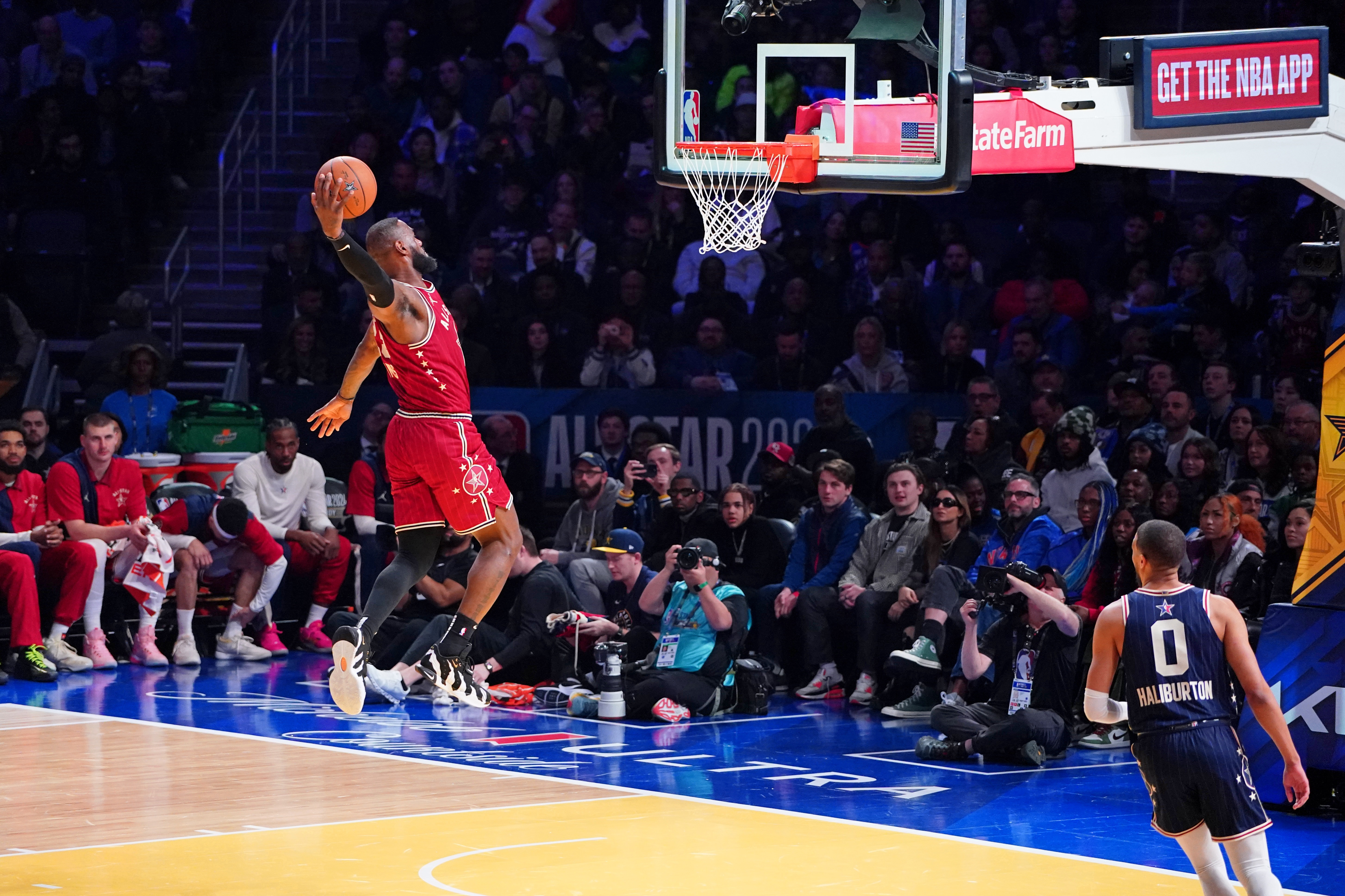 很难想象没有勒布朗的全明星赛会是什么样子,更何况本届全明星赛将在洛杉矶举办,还可能是他职业生涯的最后一次全明星之旅。我们不知道他是否会在本赛季结束后退役,没人知道,或许就连詹姆斯自己也不确定。我猜测他至少还会再打一年,效仿科比·布莱恩特的退役模式,开启长达一个赛季的告别巡演,在每个城市都受到礼遇后,再正式告别篮坛。很难想象勒布朗会效仿蒂姆·邓肯,毫无声息地淡出人们的视野。尽管如此,我们至少要考虑到这可能是他最后一次参加全明星赛的机会,因此,他理应成为受表彰的一员。
